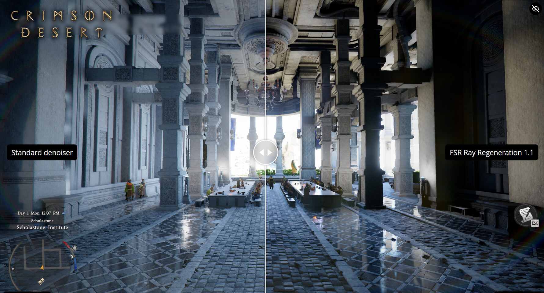 Additionally, AMD has included Ray Regeneration 1.1 in the FSR SDK 2.2. AMD’s FSR Ray Regeneration processes the noisy output that ray tracing naturally produces and cleans it up in real time, resulting in noticeably sharper and more polished visuals without requiring developers to overhaul their existing pipelines. With the update to version 1.1, it delivers much better and deeper shadows, immersive lighting, and more. You can check out the images below for comparison. The latest SDK also includes AMD FSR Frame Generation 4.0.0 in its vanilla version, as well as AMD FSR Radiance Caching 0.9.0, which is now in technical preview.